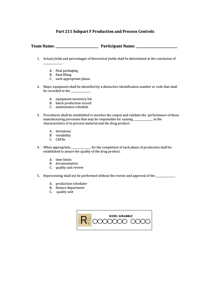 This is the sixth of eleven quizzes on CGMPs that will appear about weekly here at QA Pharm. Try it yourself and use as a discussion tool for your staff groups.